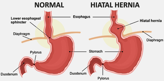 – Hiatus Hernia: this occurs when part or all of the stomach migrates from its position in the abdominal cavity into the chest through the diaphragm. This disrupts the valve and allows acid to flow into the oesophagus.